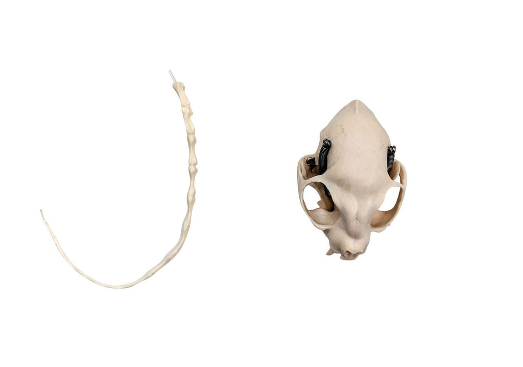This complete feline skeleton from Anatomy Lab is representative of a standard sized domestic cat featuring detailed plastic bones. The Anatomy Lab Feline Skeleton offers a view of the cervical, thoracic, lumbar, and caudal vertebrae. By articulating the several bones within the rib cage, fore and hind limbs, you get true-to-life scale of the structure of the skeletal system. The model has a removable tail and skull with articulating mandible, attached by metal pins. The skeleton is firmly mounted on a plastic base for stability and display.