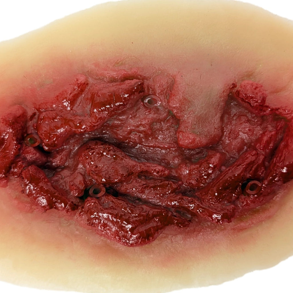Made from silicone rubber, these wounds are highly realistic, durable, reusable, hypoallergenic, and designed to be used right out of the box. With no further makeup required after application, these wounds are designed to allow trainees to identify and treat large laceration. These wounds are available in Dynamic for realistic blood flow and Static models.