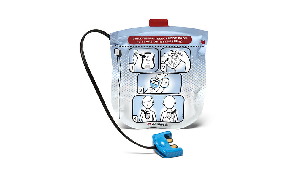 Los electrodos de desfibrilación pediátricos Defibtech (1 par) son solo para uso de niños/bebés (menores de ocho años). Los electrodos deben almacenarse ya conectados al DEA, mientras que los electrodos de repuesto adicionales se pueden almacenar en el estuche de transporte opcional.