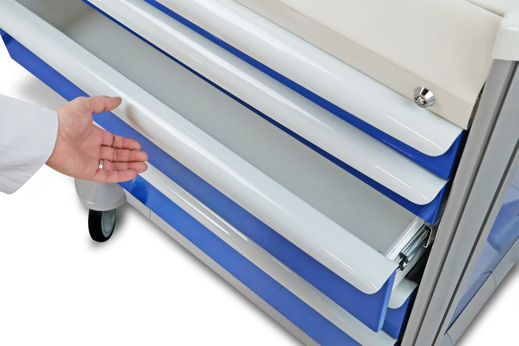 There are 10 standard colors and unlimited Pantone and RAL color options. The ABS thermoplastic countertop with molded edges is is all one continuous piece for optimal hygienic clean-up. You can specify handrails on all three sides, two, one, or none. The seamless shell body is constructed without any exposed holes for flush clean lines and more aesthetically-pleasing appearance. Spacious soft-close drawers elegantly glide shut for added convenience. Two self-closing side extension trays are included standard for additional counter space. MobileCare carts are manufactured from an aluminum cart body, high-impact plastic bumpers, and ABS countertop. All four wheels are fully rotating caster-type wheels with two locking and two non-locking casters. The 5-in/13-cm diameter 1-wheel casters offer features such as anti-static, total lock, and bead chain for static dissipation which provide easy mobility for smooth transport and nimble maneuvering (2-wheel casters are optional). The carts come standard with full wrap-around high-impact bumper trim, which extends beyond the handrails for complete protection. Versatile corner extrusion mounting provides easy optional accessory attachment and customized locations. A full range of accessories are available, including IV poles, sharps container holders, defibrillator shelves, cardiac boards, oxygen tank holders, 12-bin organizers, catheter holders, waste bins, and many more. The carts are made in the USA of American and foreign components and TAA compliant.