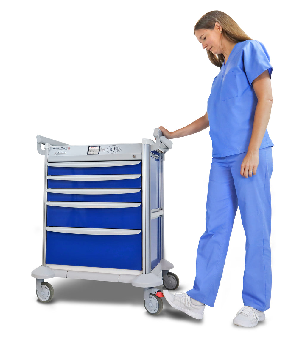 DETECTO’s innovative and highly customizable MobileCare medical carts offer the most advanced security level features available in the medical cart market. Nearly unlimited configuration possibilities are available. There are three lock types to choose from: electronic (RFID with 3 different frequencies available and full-color touchscreen pincode), quick release, and keyed. The included Windows software allows you to have one centralized point for all your employee cart access and security settings, pushed via secure Wi-Fi or Bluetooth for instant updates. The proprietary onboard and PC software has been developed by DETECTO. The innovative quick release unlocking can save lives when a patient codes, and the breakaway plastic tags and red/green flag can be reset easily by biomed techs.