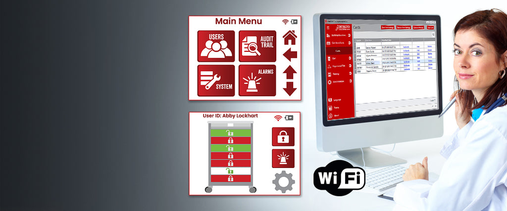 - Dual authentication available in electronic carts: RFID and pin code touchscreen entry