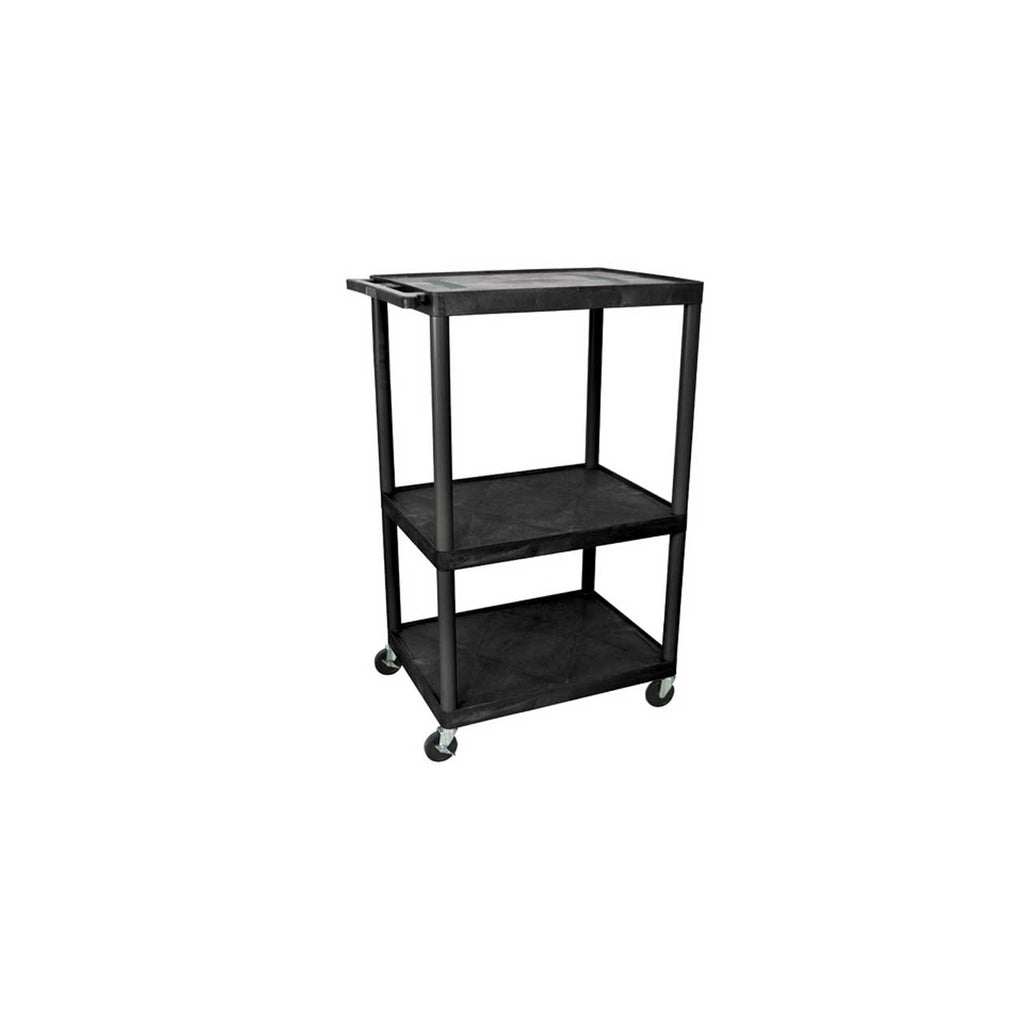 The Luxor LE54-B 54" Endura A/V Cart is a heavy-duty, lightweight cart designed for easy transport of audio-visual equipment and supplies. It features three molded polyethylene shelves with ¼" retaining lips and aluminum support bars for added strength. The cart includes a built-in three-outlet UL-listed electrical strip with a 15-foot cord and cord management system for powering devices on the go. Four 4" ball-bearing swivel casters (two locking) provide smooth maneuverability. With a durable all-plastic construction and a 400 lb load capacity, this cart is ideal for schools, offices, and conference rooms. Made in the USA and backed by a limited lifetime warranty.