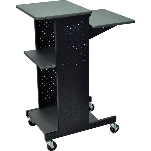 Its 40-inch standing height is comfortable for presenters, while the adjustable second shelf allows for customized equipment placement. The unit moves easily on four heavy-duty casters, two with locking brakes, ensuring stability during use.