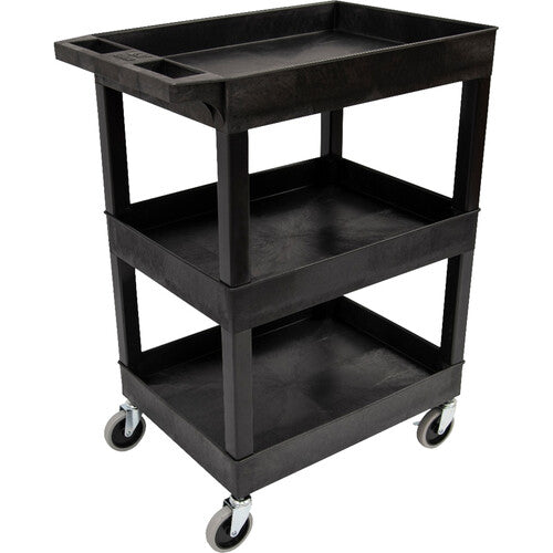 The 24" x 18" 3-Shelf Plastic Utility Tub Cart with Outrigger Bins from Luxor is a compact tub cart that is ideal for industries looking to transfer loads where durability and strength are needed. With three 2.5" deep tub shelves, this durable multipurpose cart is made of high-density polyethylene (HDPE), which is known for its incredible strength to density ratio while being resistant to stains, scratches, and dents.
