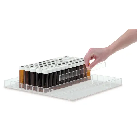 These vial trays are another great organizational solution from MarketLab. Each tray holds up to 168 vials (25mm dia) and has removable dividers to accommodate different size bottles. Ventilation slots on the tray holder allows cold air to move freely.