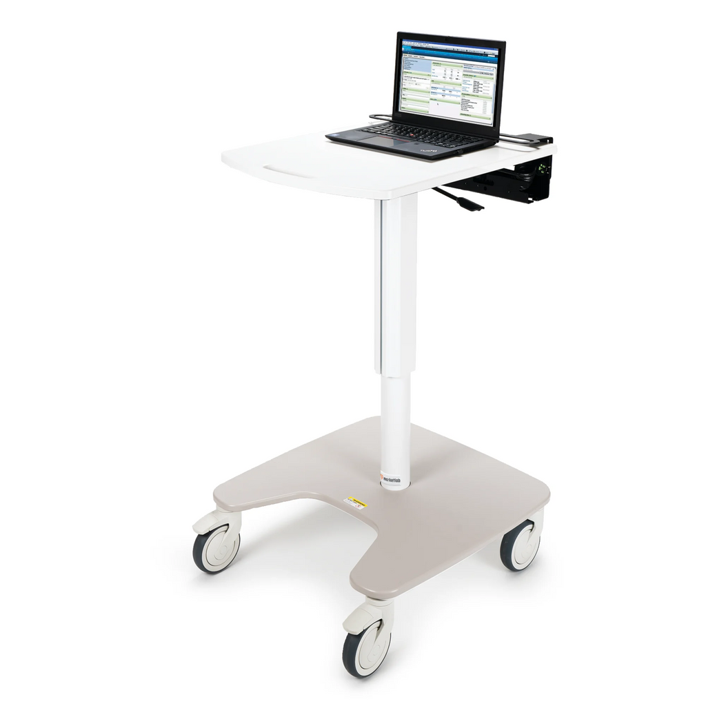 The Insight Standard Laptop Cart offers an unencumbered, secure, mobile workstation designed for the tech needs of today's healthcare professionals. The smooth work surface provides ample space for a laptop with room leftover for a few supplies. Clinicians will appreciate the hideaway mouse pad that extends from the left or right side and the ability to add optional conveniences like a glove dispenser, disinfectant wipes canister holder, and a power pack.