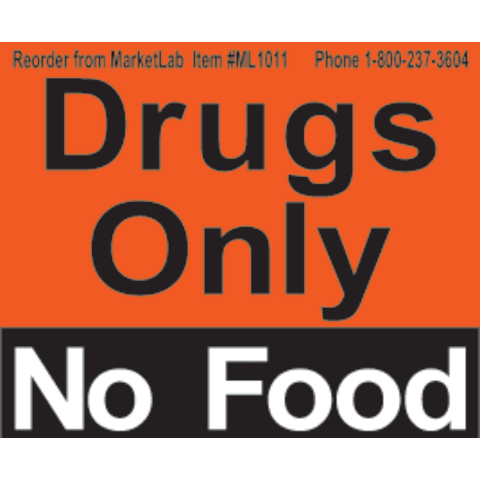 The Marketlab "Drugs Only No Food" Magnet is designed to help healthcare personnel maintain proper storage protocols in pharmacies, medication rooms, and clinical areas. Measuring 3.5"W x 3"H, the magnet is large enough to be visible while remaining compact. The durable material ensures longevity, and the magnetic backing allows for easy placement on metal surfaces such as cabinets, carts, or refrigerators. Packaged as 2/pk, this magnet promotes safe and organized medication handling.