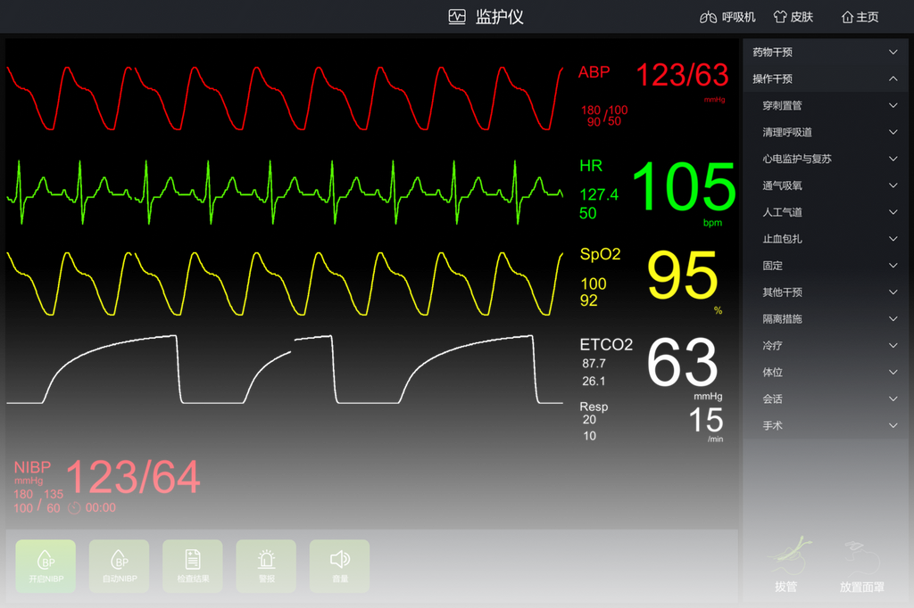 The system is designed based on the real ventilator operation interface and functions, compatible with non-invasive ventilation mode and invasive ventilation mode, which different ventilation mode shows different parameter settings and waveform changes. It also offers the vital signs monitor, convenient for displaying the patient's condition at any time, creating a safer and more reliable training scenario for users.
