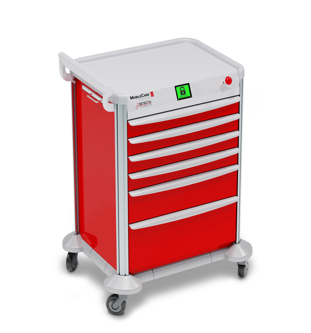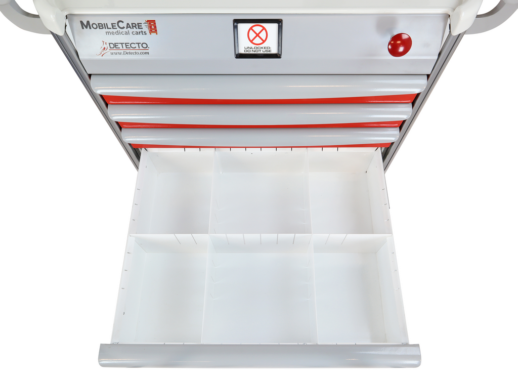 DETECTO’s innovative and highly customizable MobileCare medical carts offer the most advanced security level features available in the medical cart market. Nearly unlimited configuration possibilities are available. There are three lock types to choose from: electronic (RFID with 3 different frequencies available and full-color touchscreen pincode), quick release, and keyed. The included Windows software allows you to have one centralized point for all your employee cart access and security settings, pushed via secure Wi-Fi or Bluetooth for instant updates. The proprietary onboard and PC software has been developed by DETECTO. The innovative quick release unlocking can save lives when a patient codes, and the breakaway plastic tags and red/green flag can be reset easily by biomed techs.