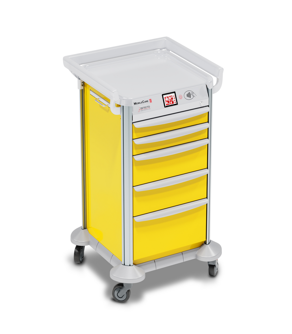 DETECTO’s innovative and highly customizable MobileCare medical carts offer the most advanced security level features available in the medical cart market. Nearly unlimited configuration possibilities are available. There are three lock types to choose from: electronic (RFID with 3 different frequencies available and full-color touchscreen pincode), quick release, and keyed. The included Windows software allows you to have one centralized point for all your employee cart access and security settings, pushed via secure Wi-Fi or Bluetooth for instant updates. The proprietary onboard and PC software has been developed by DETECTO. The innovative quick release unlocking can save lives when a patient codes, and the breakaway plastic tags and red/green flag can be reset easily by biomed techs.