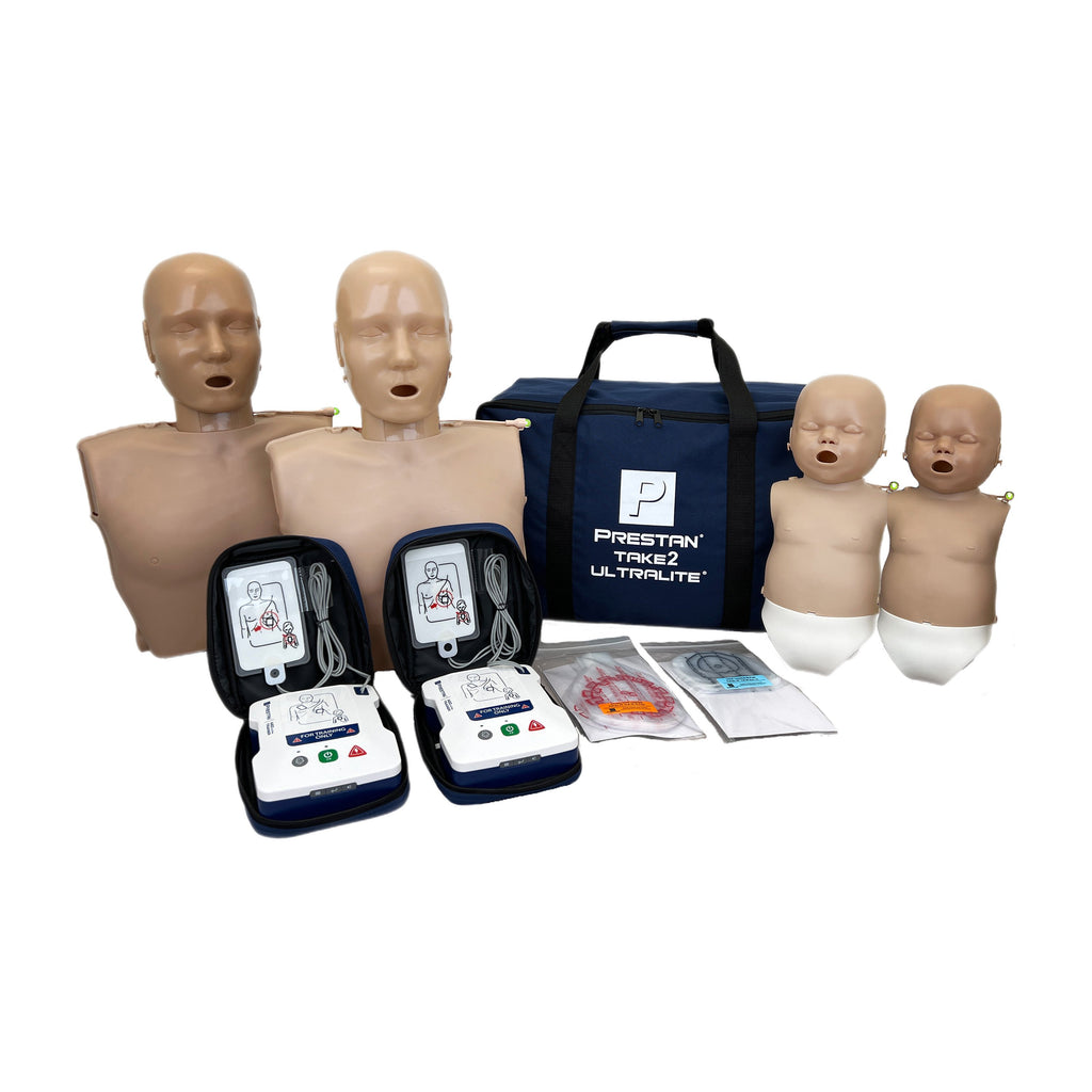The Prestan TAKE2® Ultralite® Diversity Kit with CPR Feedback, 2 Dark and 2 Medium Skin Tone is a training set combining Ultralite® CPR manikins and AED UltraTrainers™.