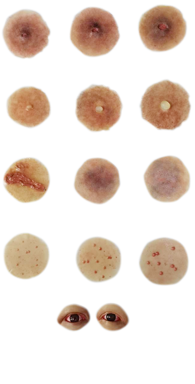 • More than 30 moulages simulating rashes, burns, blisters, ulcers and poisoning.